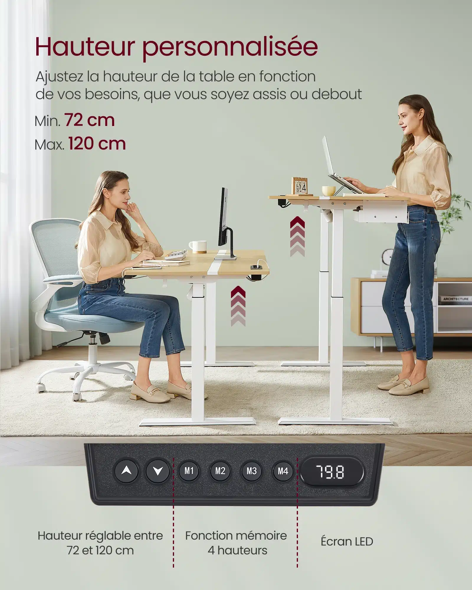 Ce bureau assis-debout est idéal pour varier les postures au fil de la journée. Il s’ajuste en hauteur de 72 à 120 cm, pour s’adapter à toutes les morphologies et envies. Grâce à la fonction mémoire, vous retrouvez vos positions préférées en un clic. Un vrai coup de pouce pour préserver votre dos, activer la circulation sanguine et mieux vous concentrer.
