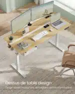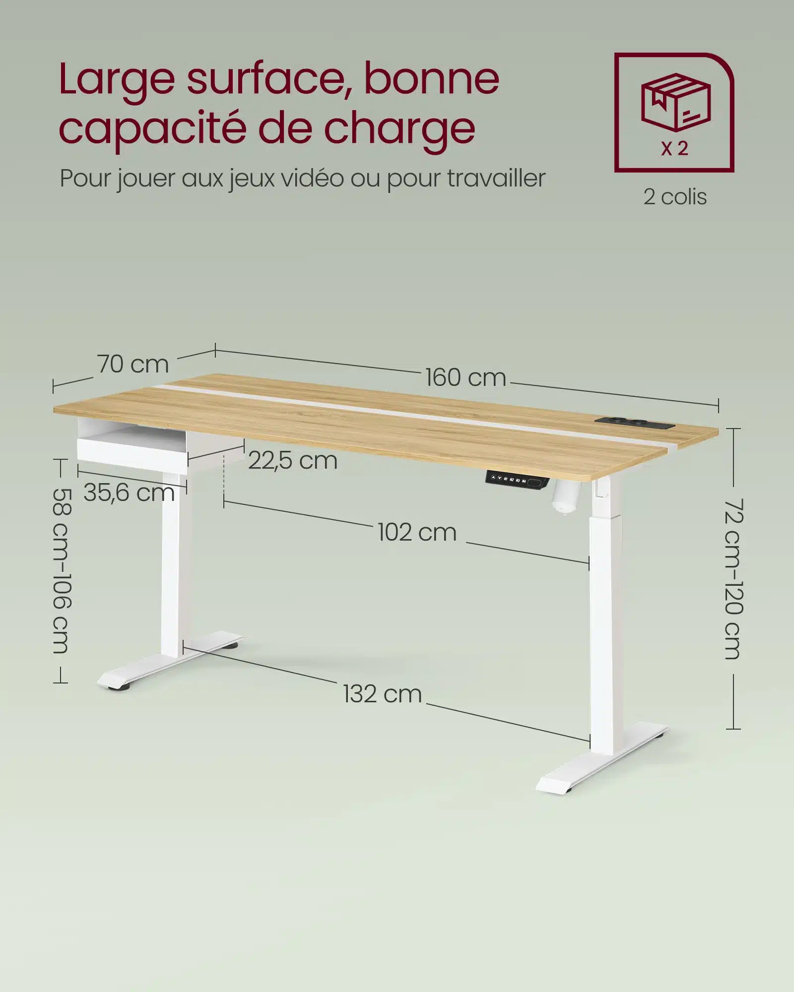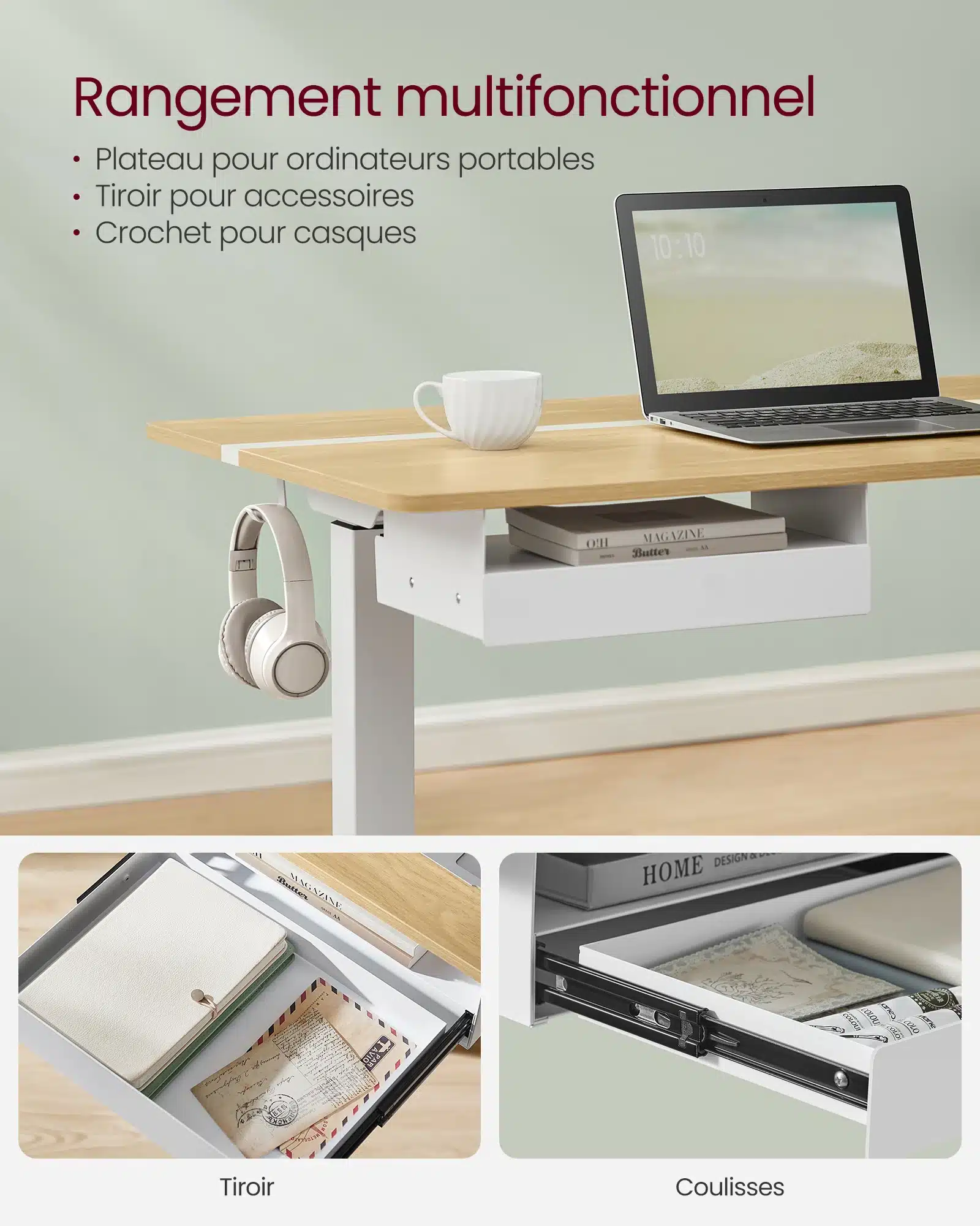 Conçu pour un usage quotidien, ce bureau assis debout électrique cache bien son jeu. Il intègre 2 prises électriques et 2 ports USB, pour brancher vos appareils sans multiplier les câbles. Son tiroir discret accueille vos fournitures, tandis qu’un crochet garde votre casque à portée de main. Stable et robuste (jusqu’à 80 kg), il repose sur des pieds réglables ou à roulettes avec freins. Et pour plus de sécurité, ses angles arrondis évitent les chocs. Parfait pour créer un poste de travail agréable, organisé et sans stress !