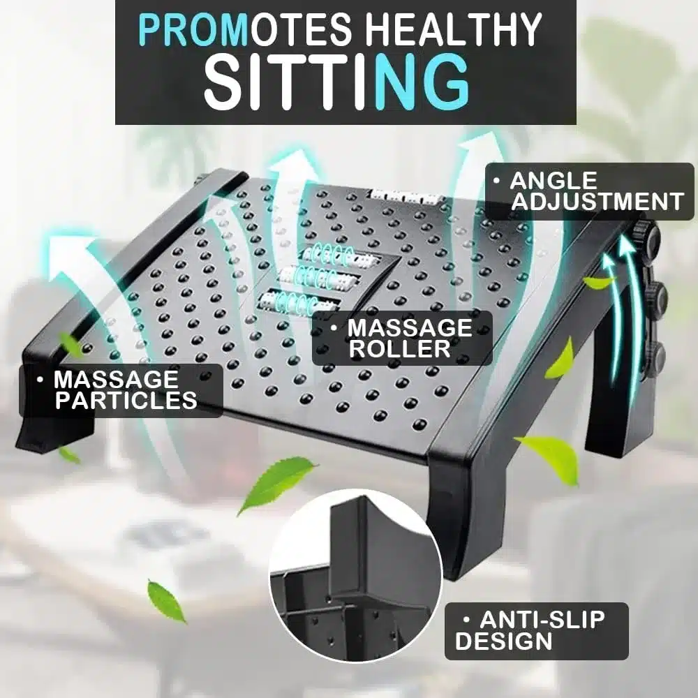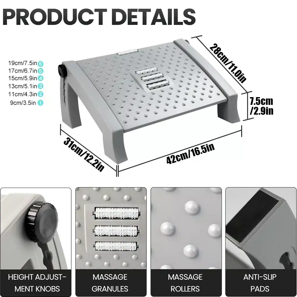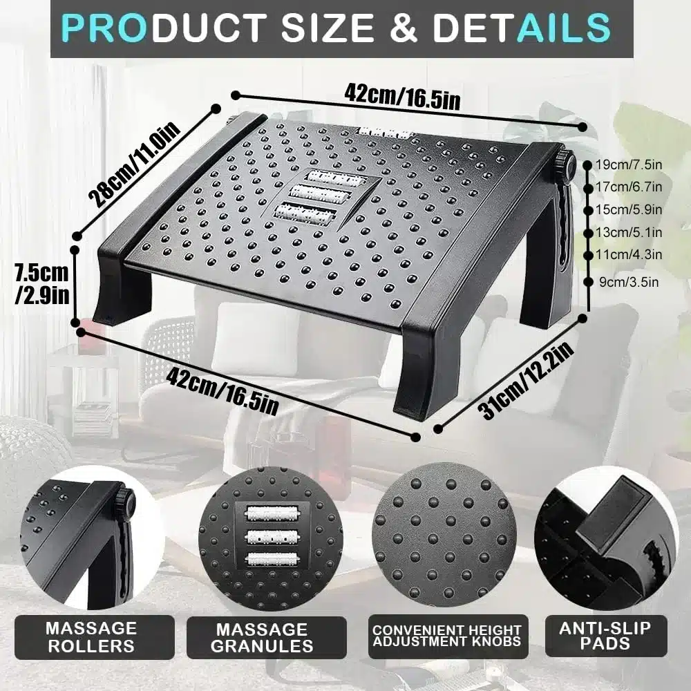 Ce repose-pieds a été conçu pour accompagner tous ceux qui passent de longues heures assis, que ce soit en télétravail, au bureau ou en gaming. Il s’ajuste en hauteur sur 6 niveaux, pour s’adapter à votre morphologie et à la hauteur de votre chaise. En surélevant vos jambes, il permet de soulager les lombaires, de réduire la pression sur les hanches et d’encourager une meilleure circulation. Sa surface texturée avec rouleaux de massage intégrés ajoute une touche de bien-être, parfaite pour se détendre sans quitter son poste de travail.