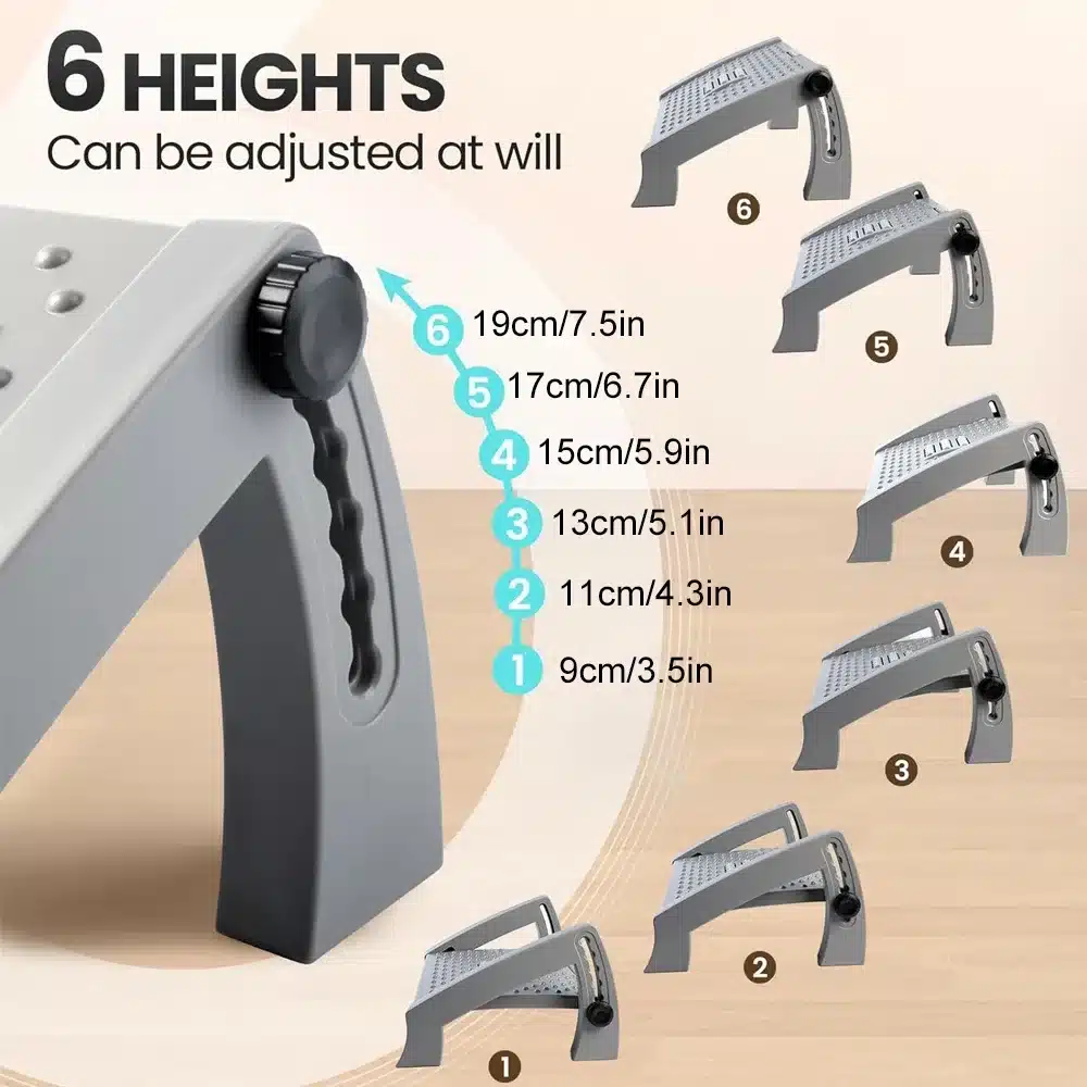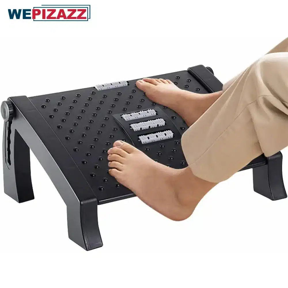 Ce repose-pieds ergonomique WEPIZAZZ coche toutes les cases : il est réglable, léger, stable, et surtout très agréable à utiliser. Sa structure en plastique renforcé (PP) garantit une excellente durabilité, même en usage quotidien. Les 6 positions de réglage permettent de choisir l’inclinaison idéale pour soulager jambes, genoux et bas du dos. Grâce à sa surface antidérapante et ses petits rouleaux massants, vous pouvez bouger légèrement les pieds pour activer la circulation et éviter les tensions. Facile à nettoyer, démontable et compact, il se glisse sans souci sous un bureau ou dans un sac pour les déplacements. Que vous soyez sédentaire ou en télétravail, c’est un accessoire indispensable pour dire adieu aux douleurs… et bonjour au confort sur-mesure.