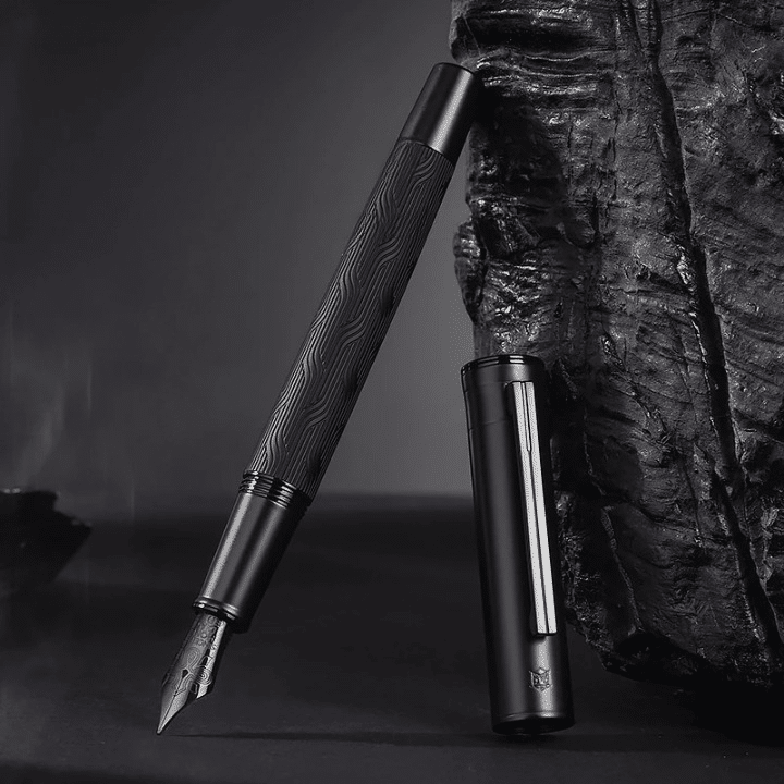 Stylo Ergonomique à Plume Haut de Gamme en Titane posé sur une pierre noire