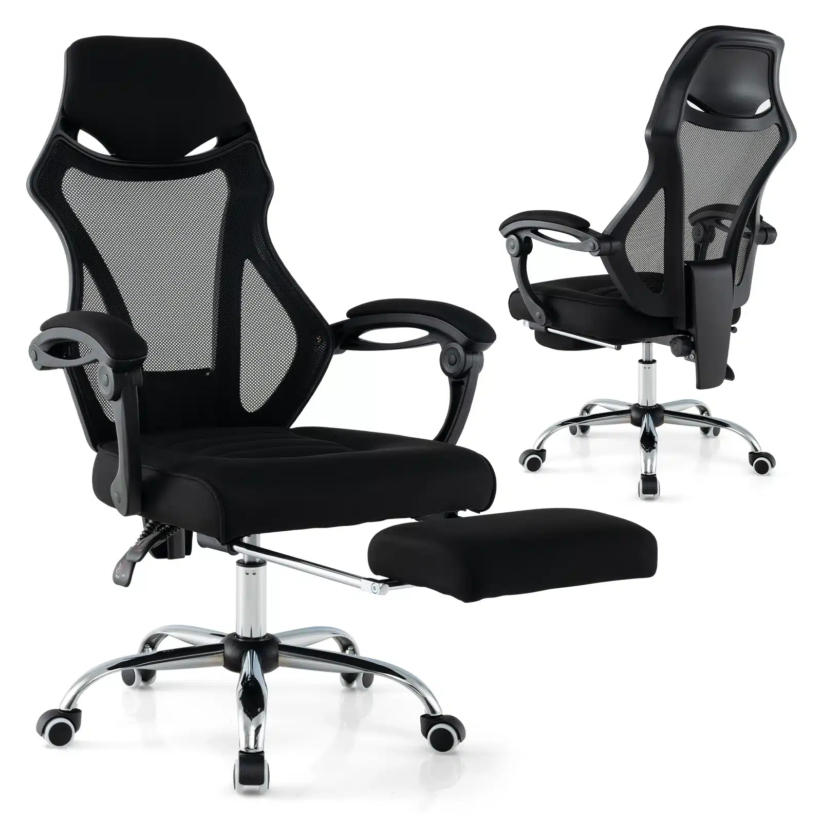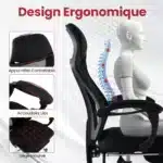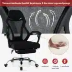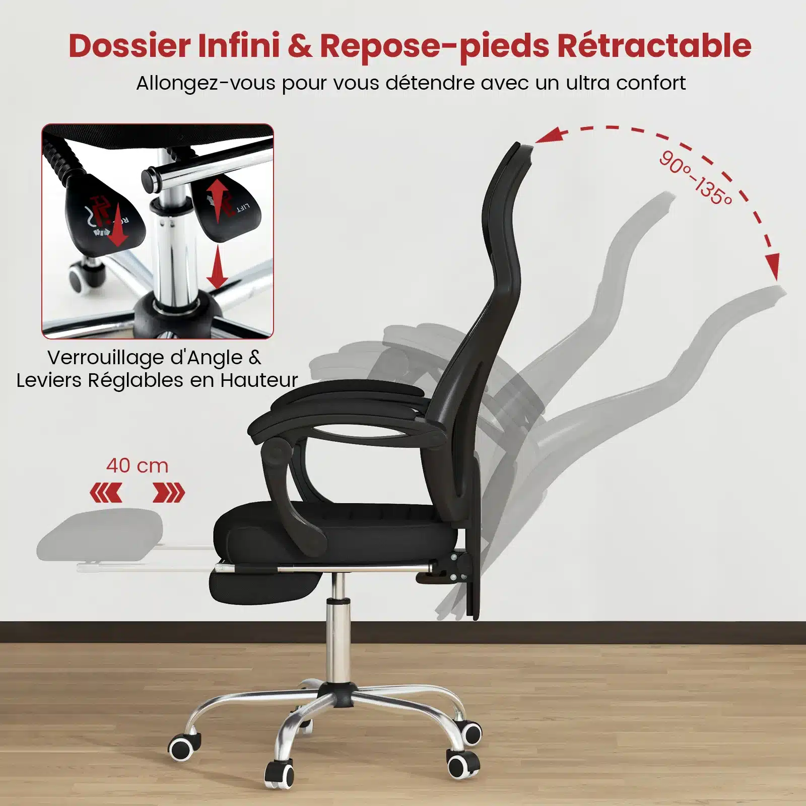 Chaise de Bureau Ergonomique en Maille avec Repose-Pieds, Chaise de Direction Pivotante avec Appui-tête Fauteuil Inclinable Dossier Réglable, Chaise d’Ordinateur avec Accoudoirs, Noir