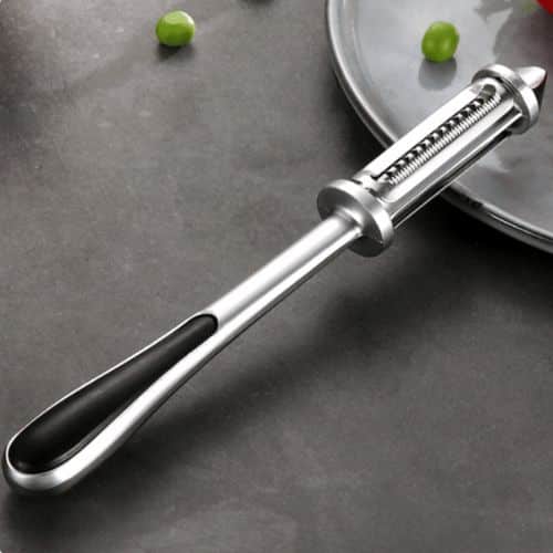 Eplucheur de Cuisine Ergonomique en Acier Inoxydable pour Fruits et Légumes sur fond gris