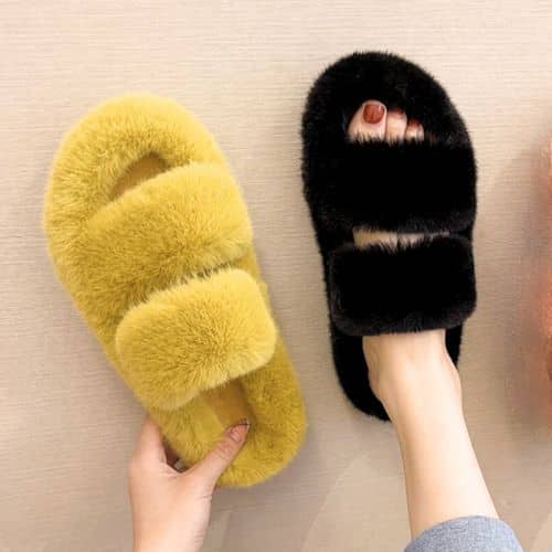 Chausson en fourrure noire portée par le pied d'une femme, on voit aussi un chausson jaune tenu à la main.