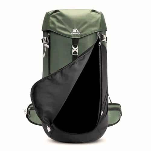 Sac à Dos Ergonomique de Montagne Étanche ouvert au centre du sac et sur fond blanc