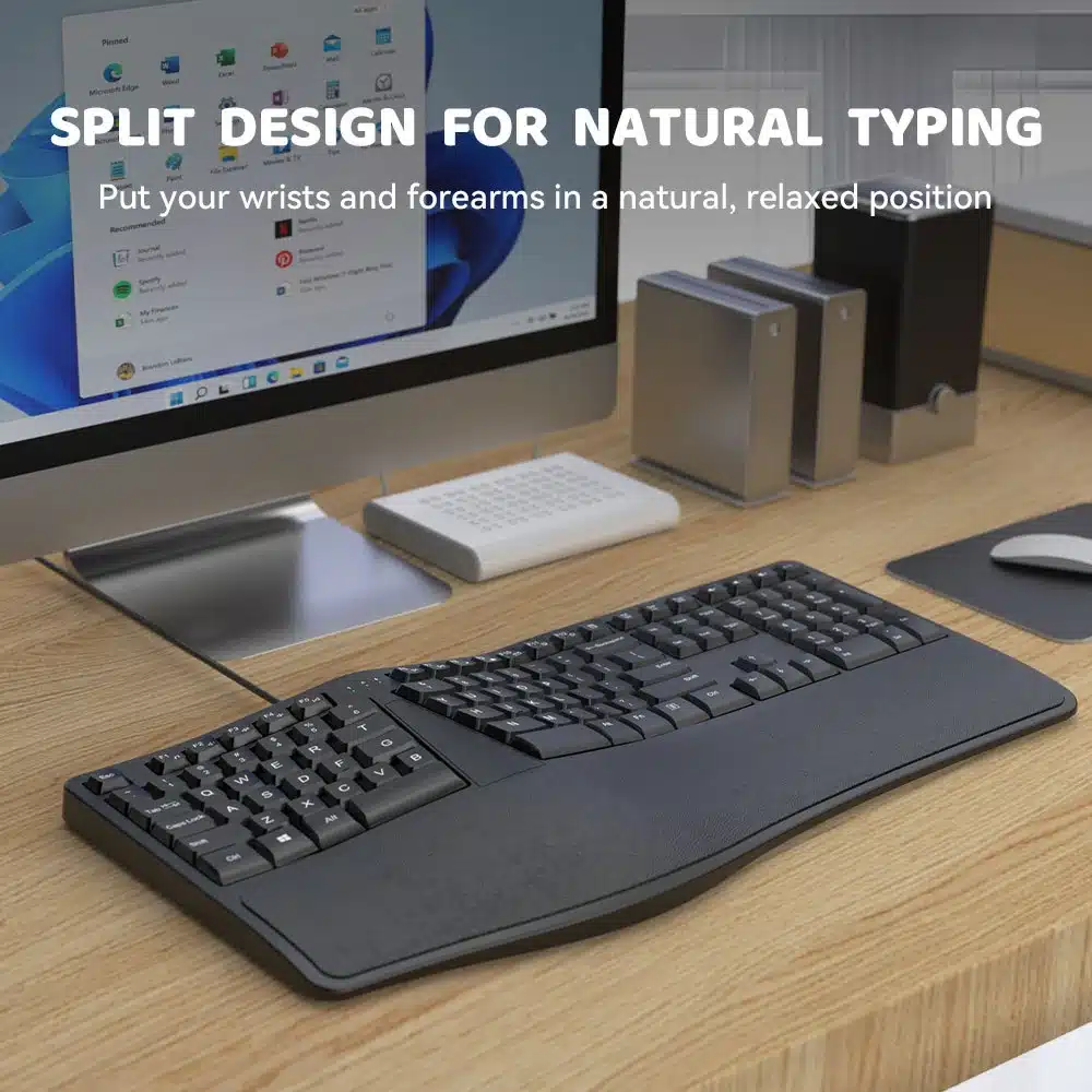 Ce clavier ergonomique combine une conception pensée pour le confort articulaire avec une structure robuste et efficace. Son coussinet repose-poignet intégré soulage la pression exercée sur les poignets en position prolongée, tout en gardant vos mains dans un alignement naturel. Les touches sont disposées de façon incurvée pour accompagner le mouvement de vos doigts, et la frappe membrane offre un bon équilibre entre douceur et réactivité. Facile à installer via USB, il est compatible avec la plupart des appareils (PC, ordinateurs portables, tablettes…). Son format pleine taille et son design sobre le rendent idéal aussi bien pour un usage professionnel que personnel. Un excellent choix pour gagner en confort sans sacrifier l’efficacité.
