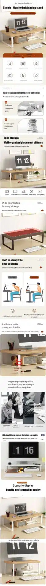 En surélevant votre écran d’environ 8 cm, ce support réduit efficacement la fatigue visuelle et les douleurs cervicales liées à une mauvaise posture. Il convient à la majorité des écrans standards (vérifiez simplement la largeur avant achat). Son design ajouré sous la base permet de glisser facilement des objets du quotidien : clavier, agenda, lunettes, etc. Fabriqué en matériaux légers et résistants, il est conçu pour un usage durable au quotidien. Un indispensable pour tous ceux qui passent de longues heures devant l’écran.