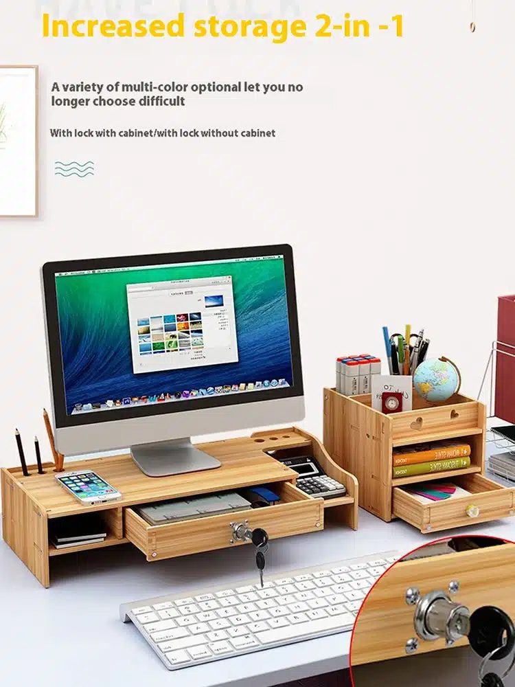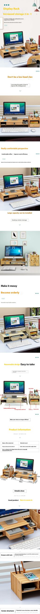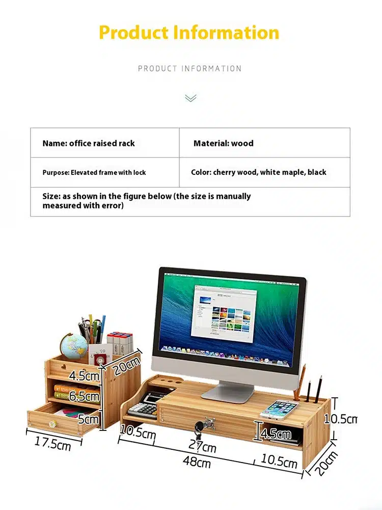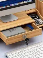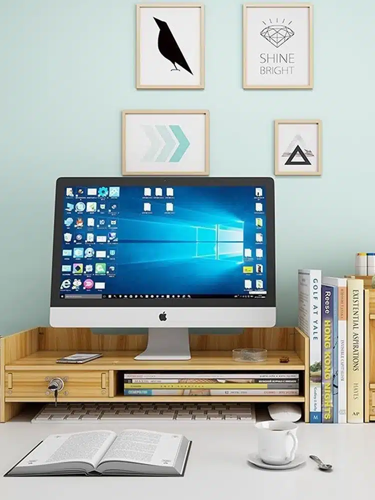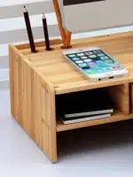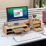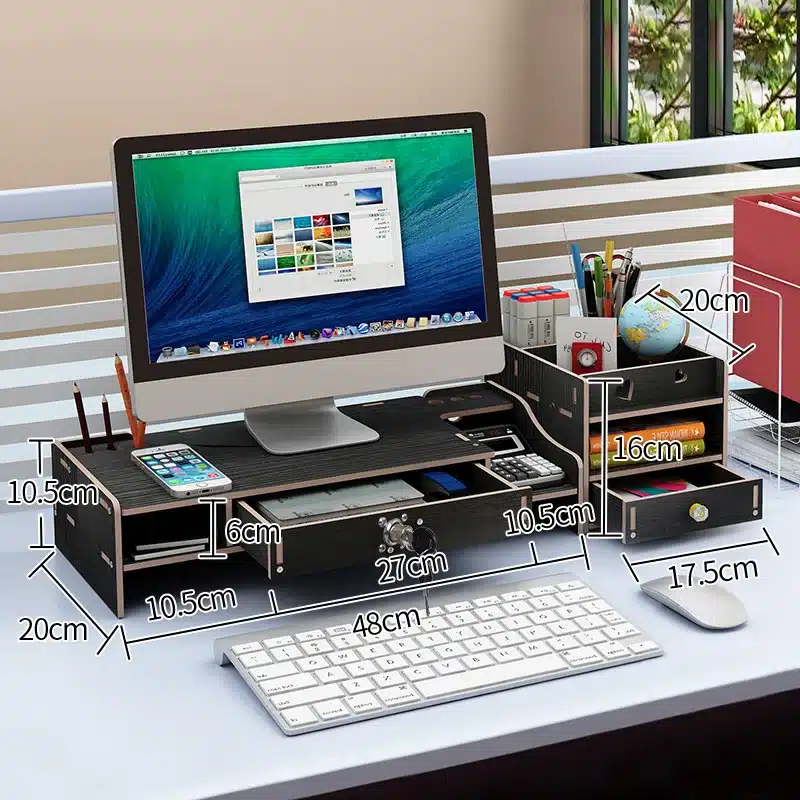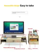 Ce rehausseur d’écran en bois n’est pas qu’un simple accessoire : c’est un véritable allié santé et productivité. Son élévation de 11 cm permet de replacer l’écran à hauteur des yeux, réduisant les douleurs au cou et au dos liées à une mauvaise posture. En dessous, un large espace accueille clavier, souris ou documents. Le support pour stylos et accessoires vous aide à garder un bureau net et organisé. Conçu avec un bois lisse et résistant, il est simple à monter et facile à entretenir. Son repose-nuque verrouillable assure une position personnalisée et stable, idéale pour les longues sessions de travail ou de jeu. Polyvalent, il s’intègre aussi bien dans un home office, un bureau professionnel qu’un coin gaming. Et grâce à l’effet légèrement surélevé, votre ordinateur respire mieux, pour une meilleure durabilité. Bref, un support complet, pensé pour votre bien-être.