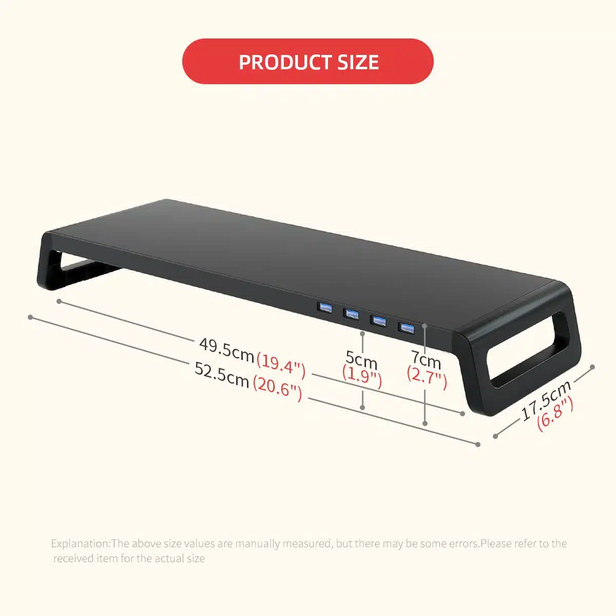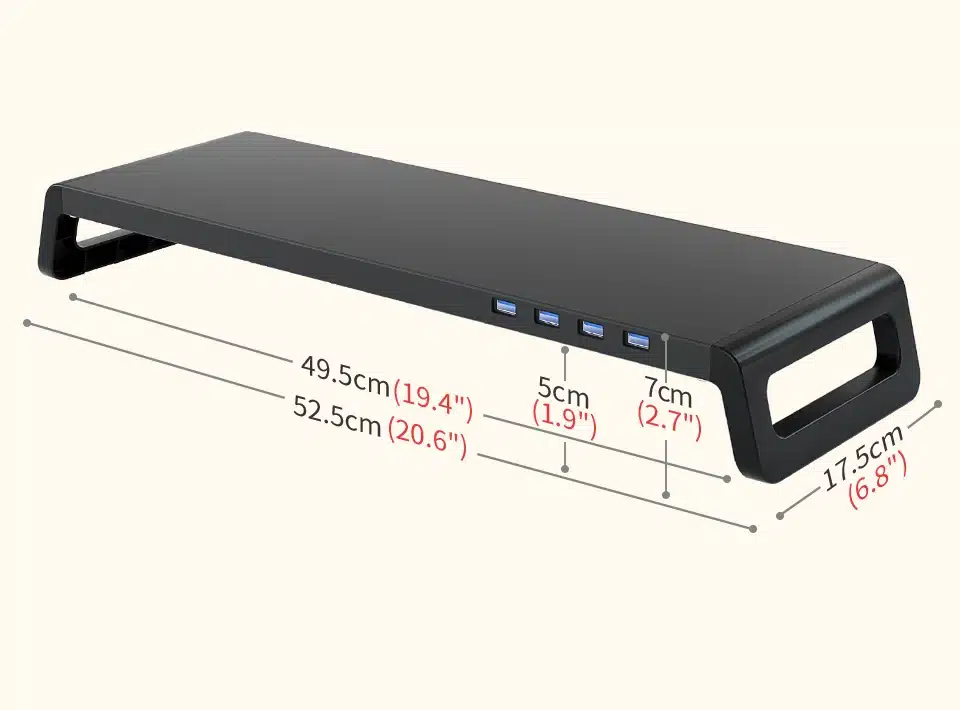Ce rehausseur LIBOER offre un excellent compromis entre design moderne et fonctionnalités pratiques. Avec ses dimensions de 52,5 x 17,5 x 7 cm, il s’adapte à la majorité des écrans et ordinateurs portables. Sa structure légère (660 g) supporte jusqu’à 15 kg sans faiblir grâce à son alliage aluminium/ABS robuste. L’espace de 48 cm sous le plateau permet de ranger clavier, souris ou fournitures et garder un bureau bien dégagé. Les ports USB 3.0 à haute vitesse offrent une connectivité fluide, que ce soit pour charger vos appareils ou transférer des données rapidement. Simple à assembler, agréable au toucher, il s’intègre parfaitement dans un bureau moderne. Un accessoire compact mais complet, qui améliore à la fois votre confort physique et votre efficacité numérique.