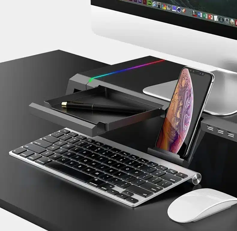 En surélevant votre moniteur ou votre ordinateur portable, ce support améliore immédiatement votre posture visuelle. Moins de tensions dans la nuque, plus de confort au quotidien ! Il ne se contente pas d’être ergonomique : il est aussi ultra-pratique. Grâce à ses deux tiroirs intégrés et son support pour smartphone, vous gagnez de l’espace tout en gardant vos essentiels à portée de main. Un vrai plus pour travailler efficacement, que ce soit à la maison ou au bureau.
